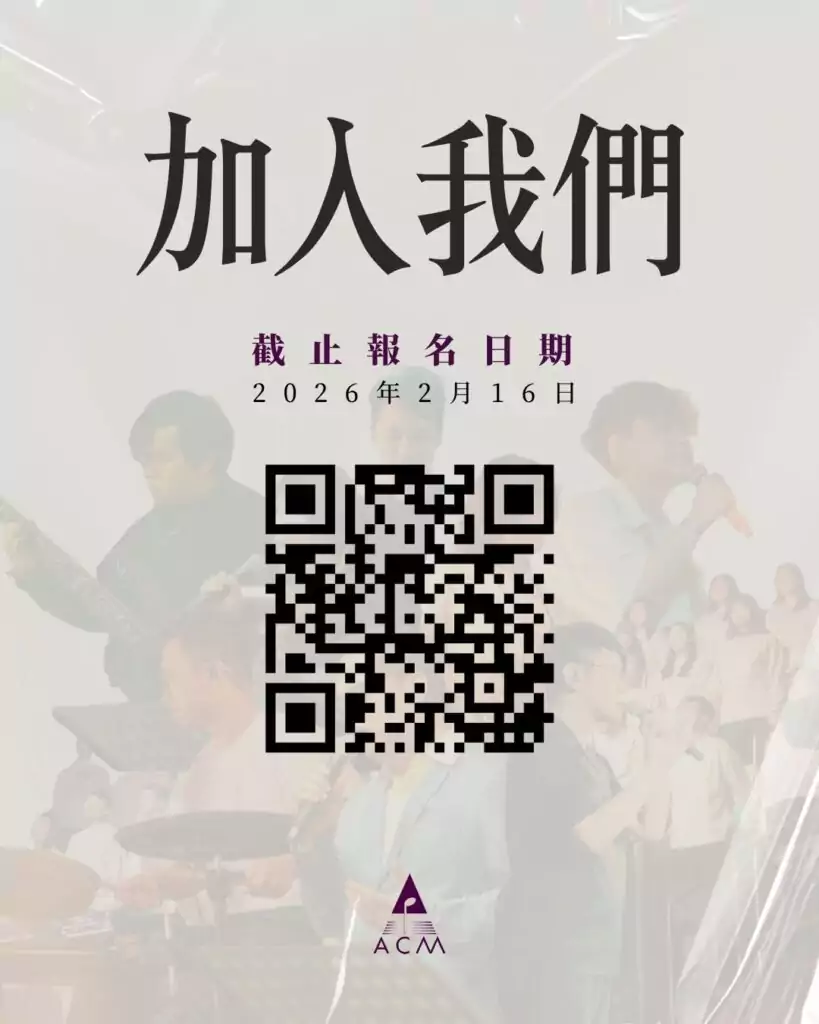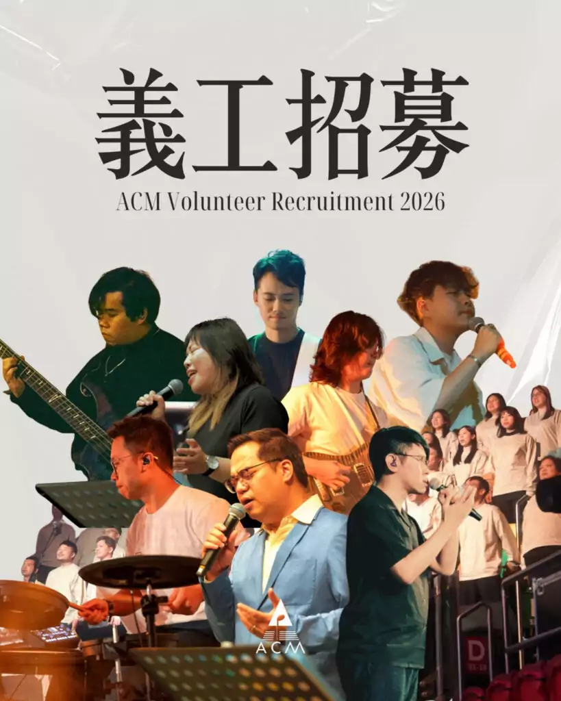 感謝神的恩典!ACM每年會到本地及海外不同地方的教會及場館服侍,透過敬拜讚美及音樂製作服侍信徒,廣傳福音,成員都在當中經歷上帝大能的作為!ACM團隊有不同崗位,包括歌唱、彈奏、投影、音響、多媒體製作及其他幕後服侍,如果你想發揮天父賜予的恩賜,希望服侍和經歷祂,我們歡迎你加入成為ACM大家庭的一分子!