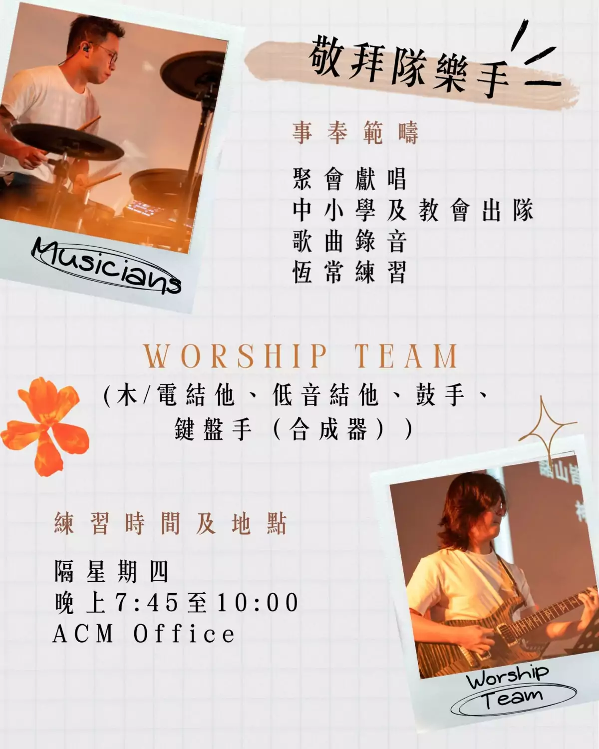 敬拜隊樂手(木或電結他、低音結他、鼓手、鍵盤手(合成器))