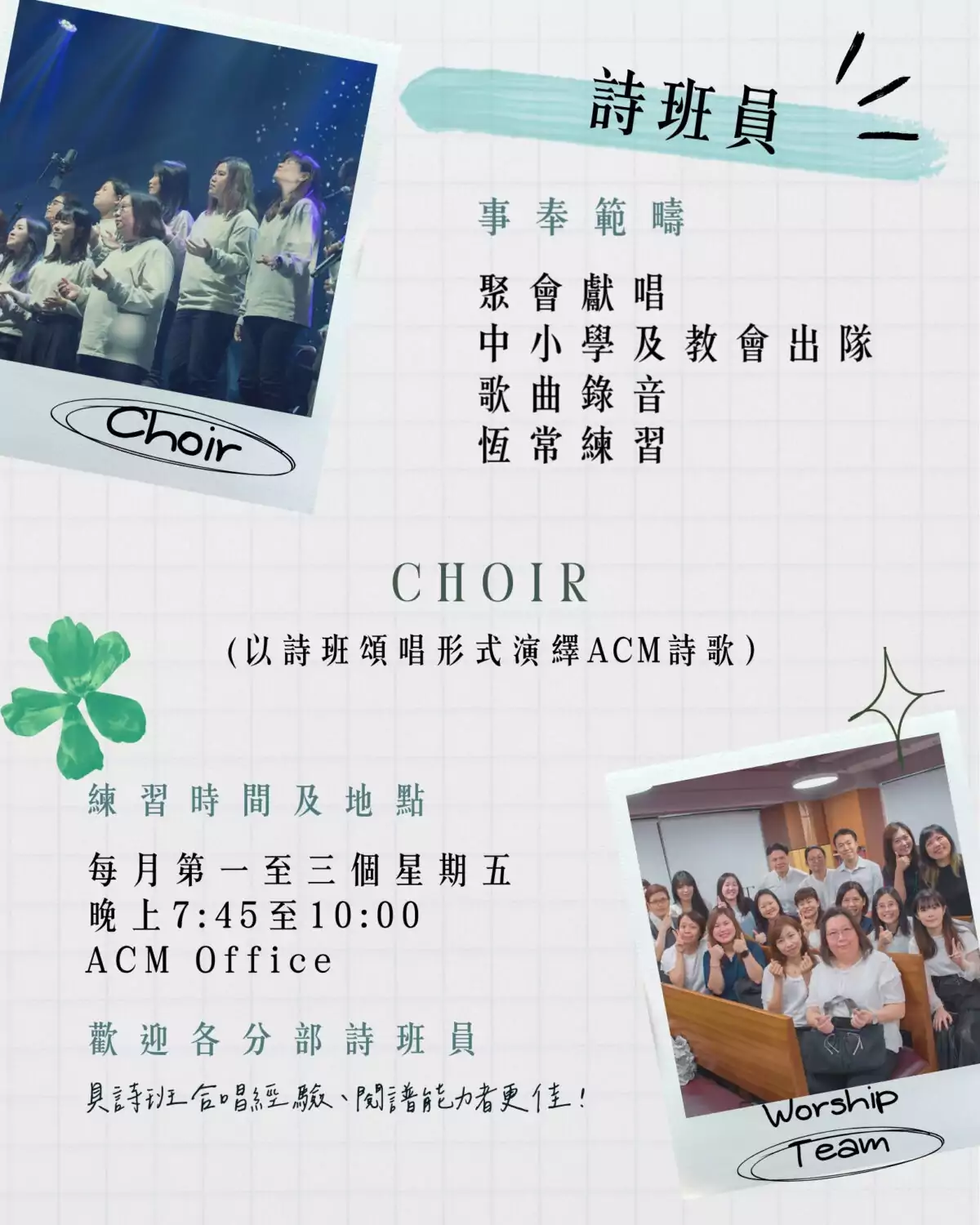 - 願意以歌唱事奉神及出席恆常詩班練習